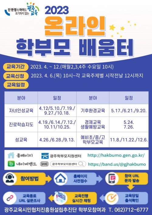 ±³À°½ÅûÀº ¿À´Â 6ÀÏ 10½ÃºÎÅÍ °¢ °úÁ¤º° ±³À°Àü³¯ 12½Ã±îÁö ±¤ÁÖÇкθðÁö¿ø¼¾ÅÍ ´©¸®Áý¿¡¼ »çÀü ½Åû °¡´ÉÇÏ´Ù. ÀÚ¼¼ÇÑ ³»¿ëÀº ±¤ÁÖ±³À°½Ã¹ÎÇùÄ¡ÁøÈï¿ø¼³¸³ÃßÁø´Ü ÇкθðÂü¿©°ú·Î ¹®ÀÇÇÏ¸é µÈ´Ù.