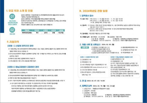 ±³À°°úÁ¤Àº ÃÑ 120ÇÐÁ¡(Àü°ø 102, ±³¾ç 18)À¸·Î ±¸¼ºµÅ ÀÖÀ¸¸ç, ¸ðÁý´ë»óÀº °íµîÇб³ Á¹¾÷(µ¿µîÇÑ Çз ÀÎÁ¤) ÀÌ»ó Çз ¼ÒÁöÀÚ·Î °ü³» ³ó¡¤»ý¸íºÐ¾ß »ê¾÷ü µî¿¡ 10°³¿ù ÀÌ»ó ÀçÁ÷ÇÑ ¼Ò¼Ó ±Ù·ÎÀÚ ¹× ´ëÇ¥ÀÚ ¶Ç´Â °ü³» ¿µ³óÁ¶ÇÕ ¹ýÀο¡ 10°³¿ù ÀÌ»ó ¼Ò¼ÓµÅ ÀÖ´Â Á¶ÇÕ¿ø µîÀÌ´Ù.