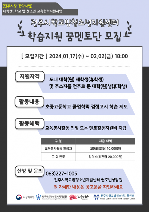 ÀüÁֽà Çб³ ¹Û û¼Ò³âÀÇ Áß°íµîÇб³ Á¹¾÷ Çз °ËÁ¤°í½Ã ÇнÀÀ» µ½±æ Èñ¸ÁÇÏ´Â ÀüÁÖÁö¿ª ´ëÇÐ(¿ø)»ýÀº ´ëÇÐ °Ô½ÃÆÇ°ú ÀüÁÖ½Ãû¼Ò³â»ó´ãº¹Áö¼¾ÅÍ ´©¸®ÁýÀ» Âü°íÇØ ¿À´Â 2¿ù 2ÀϱîÁö ¡®ÀüÁֽà ²Þµå¸² ²Þ¸àÅä´Ü¡¯À¸·Î Áö¿øÇÏ¸é µÈ´Ù.