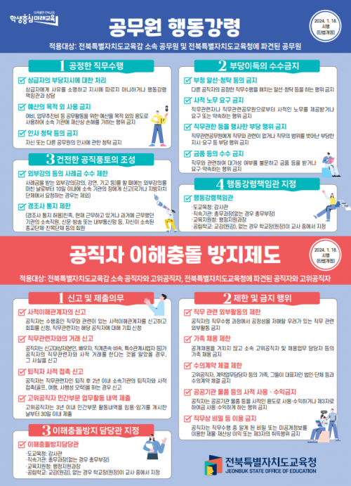 ÀüºÏ±³À°Ã»Àº °ø¹«¿ø Çൿ°·É¿¡ ´ëÇÑ ÀÌÇØµµ¸¦ ³ôÀÌ°í °øÁ¤ÇÑ Á÷¹«¼öÇà ¹× Ã»·ÅÀÇ½Ä Á¦°í¸¦ À§ÇØ ¡®°ø¹«¿ø Çൿ°·É¡¯°ú ¡®°øÁ÷°ú ÀÌÇØÃæµ¹ ¹æÁöÁ¦µµ¡¯¸¦ ÇÑ´«¿¡ º¼ ¼ö ÀÖ´Â È«º¸ Æ÷½ºÅÍ·Î Á¦ÀÛ, ¼Ò¼Ó±â°ü ¹× µµ³» Çб³¿¡ ¾È³»Çß´Ù°í 12ÀÏ ¹àÇû´Ù.