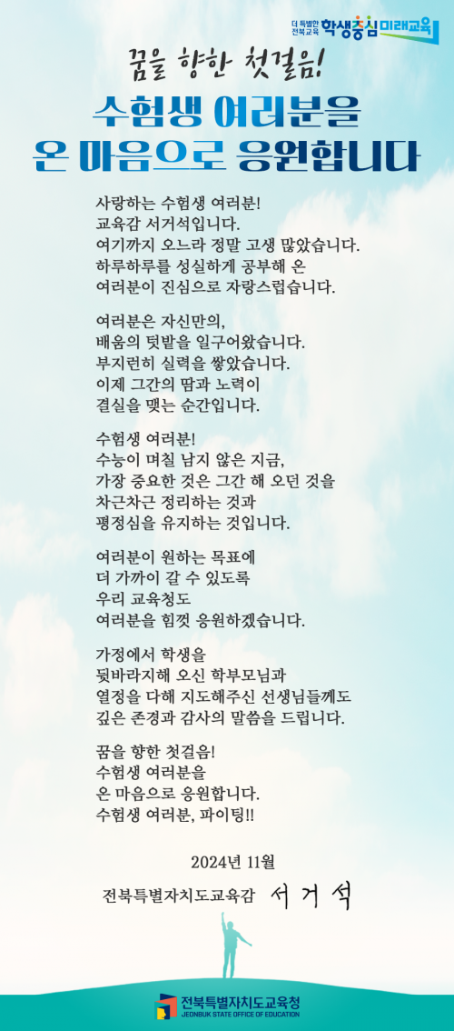¸¶Áö¸·À¸·Î ¼ ±³À°°¨Àº ¡°²ÞÀ» ÇâÇØ ù°ÉÀ½À» ³»µó´Â ¼öÇè»ý ¿©·¯ºÐÀ» ¿Â ¸¶À½À¸·Î ÀÀ¿øÇϰڴ١±¸é¼ ¡°Áö±Ý±îÁö ³ë·ÂÇÑ ½Ã°£À» ¹Ï°í, Â÷ºÐÇÏ°í ´ã´ëÇÏ°Ô ³²Àº ½Ã°£À» º¸³»´Þ¶ó¡±°í ´çºÎÇß´Ù.
