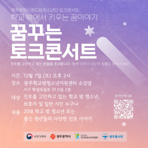 À̹ø ÅäÅ©ÄܼƮ´Â 20´ë Çб³ ¹Û û¼Ò³â°ú ¼ºÀå û³âµéÀÌ ±¤ÁÖÁö¿ª Çб³ ¹Û û¼Ò³â°ú º¸È£ÀÚ, À¯°ü±â°ü °ü°èÀÚ, ÀÏ¹Ý ½Ã¹Îµé¿¡°Ô ÀڽŵéÀÇ ´Ù¾çÇÑ Áø·Î À̾߱⸦ µé·ÁÁØ´Ù.