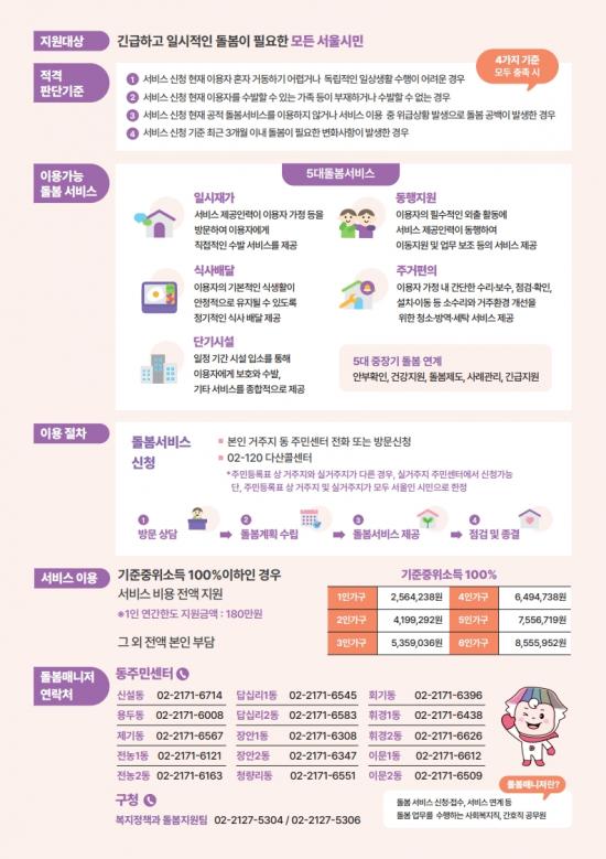 ±ä±ÞÇϰí ÀϽÃÀû µ¹º½ÀÌ ÇÊ¿äÇÑ ¼¿ï½Ã¹ÎÀ» ´ë»óÀ¸·Î 5´ë µ¹º½¼ºñ½º(¡ãÀϽÃÀç°¡ ¡ã´Ü±â½Ã¼³ ¡ãµ¿ÇàÁö¿ø ¡ãÁÖ°ÅÆíÀÇ ¡ã½Ä»ç¹è´Þ)¿Í 5´ë ÁßÀå±â µ¹º½¿¬°è(¡ã¾ÈºÎÈ®ÀÎ ¡ã°Ç°Áö¿ø ¡ãµ¹º½Á¦µµ ¡ã»ç·Ê°ü¸® ¡ã±ä±ÞÁö¿ø) µî ¸ÂÃãÇü 10´ë µ¹º½¼ºñ½º¸¦ Áö¿øÇϰí ÀÖ´Ù. Àú¼ÒµæÃþ ¹× ÁßÀ§¼Òµæ 100% ÀÌÇÏ °¡±¸¿¡´Â Àü¾× Áö¿øµÇ¸ç, ±× ¿Ü °¡±¸´Â Àü¾× º»ÀÎ ºÎ´ãÀÌ´Ù.